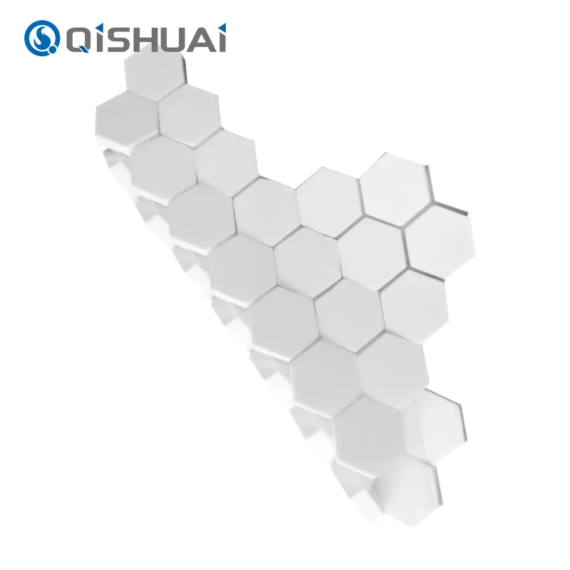 Khảm gốm Hex Alumina chất lượng cao của Shandong Qishuai Equipment Co., Ltd., như được minh họa, có thiết kế hình lục giác đặc biệt khiến chúng khác biệt với gạch hình vuông hoặc hình tròn thông thường. Mỗi viên gạch khảm gốm alumina hình lục giác đều có các cạnh mịn, mượt mà với các chi tiết tinh tế có thể nhìn thấy rõ ràng.
