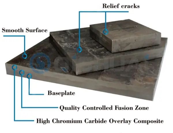 | Sự cọ rửa vật liệu nghiêm trọng và hao mòn nhanh | 1. Độ cứng của lớp chịu mài mòn (HRC)2. Loại cacbua và phân bố | 1. Lớp hợp kim có độ cứng cao (HRC 60+)2. Cấu trúc chống mài mòn dày đặc và đồng đều | Cắt, hàn, cố định bu lông |